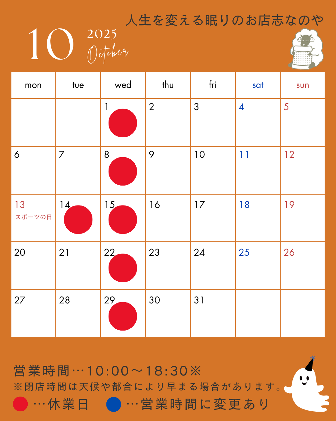 2025年10月の休業日のご案内
